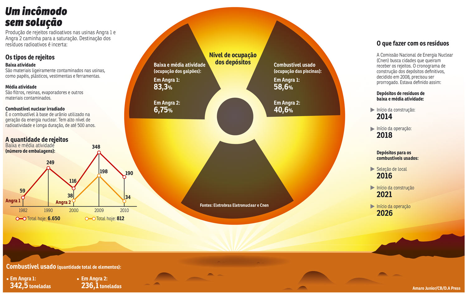 A Comissão Nacional de Energia Nuclear (Cnen), responsável pela destinação final dos rejeitos, admitiu ao Correio que o cronograma não será cumprido. Será necessário prorrogar prazos, o que deve gerar um impasse. Mesmo se o cronograma previsto fosse cumprido, a Eletrobras Eletronuclear — a quem cabe administrar as usinas — ficaria cinco anos sem ter como depositar o combustível usado, caso os reatores continuem a funcionar. “Se os depósitos não forem construídos, será necessário parar as usinas”, afirma o coordenador de Comunicação e Segurança da Eletronuclear, José Manuel Diaz.