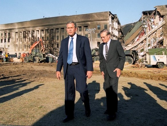 Former President George W. Bush and then-Secretary of Defense Rumsfeld survey the damage to the Pentagon caused by the terrorist attack one day after the incident in 2001. "President Bush put together close to 50 countries for the Afghan coalition, some 40 countries for the Iraqi coalition, more than 90 countries for the Proliferation Security Initiative and over 90 countries in the Global War on Terror, and yet as your question suggested," Rumsfeld says, "he was called a 'unilateralist.'"