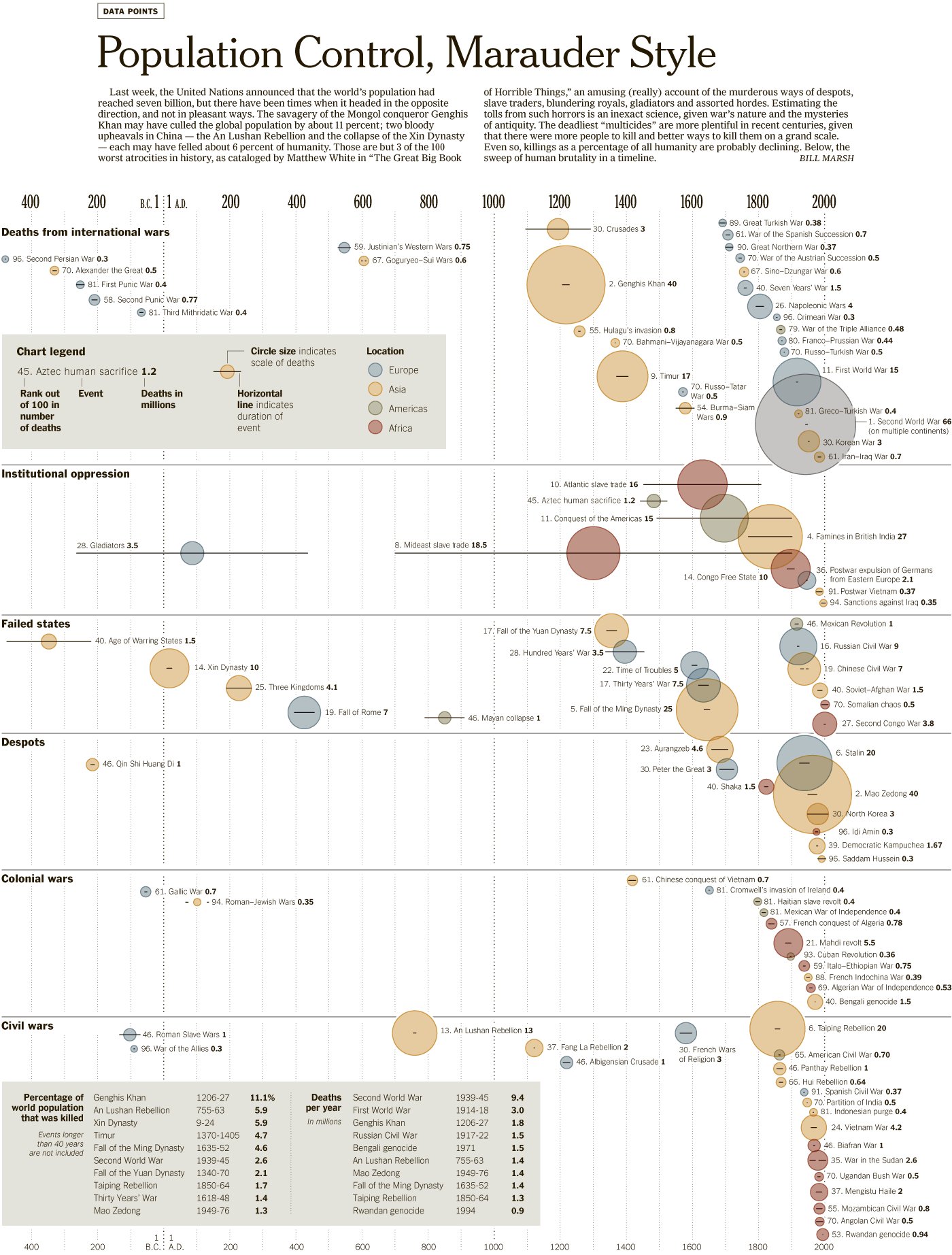Last week, the United Nations announced that the world’s population had reached seven billion, but there have been times when it headed in the opposite direction, and not in pleasant ways. The savagery of the Mongol conqueror Genghis Khan may have culled the global population by about 11 percent; two bloody upheavals in China — the An Lushan Rebellion and the collapse of the Xin Dynasty — each may have felled about 6 percent of humanity. Those are but 3 of the 100 worst atrocities in history, as cataloged by Matthew White in “The Great Big Book of Horrible Things,” an amusing (really) account of the murderous ways of despots, slave traders, blundering royals, gladiators and assorted hordes. Estimating the tolls from such horrors is an inexact science, given war’s nature and the mysteries of antiquity. The deadliest “multicides” are more plentiful in recent centuries, given that there were more people to kill and better ways to kill them on a grand scale. Even so, killings as a percentage of all humanity are probably declining. Here is a look at the sweep of human brutality presented in a timeline.