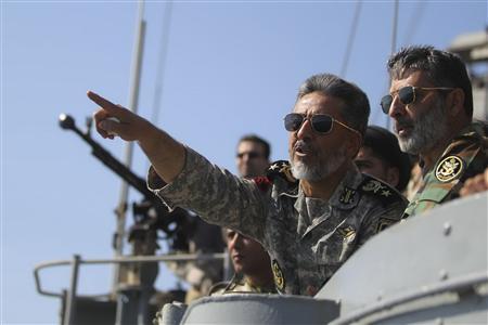 Iran's Navy commander Habibollah Sayyari points while standing on a naval ship during Velayat-90 war game on Sea of Oman near the Strait of Hormuz in southern Iran (por um momento, achei que fosse o Patriota...)