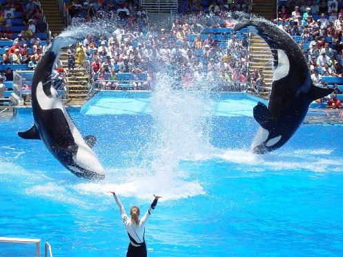 The whales perform water acrobatics at the SeaWorld amusement parks in San Diego and in Orlando, Florida.