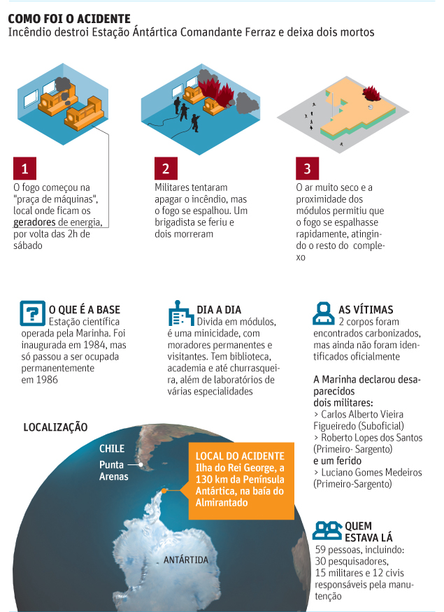 O incêndio na casa de máquinas da Estação Antártica Comandante Ferraz levou à destruição de 70% da base, informou neste domingo (26) a Marinha. Além disso, foi divulgado que os corpos dos militares mortos no acidente foram encontrados. O acidente, que ocorreu na madrugada de sábado.