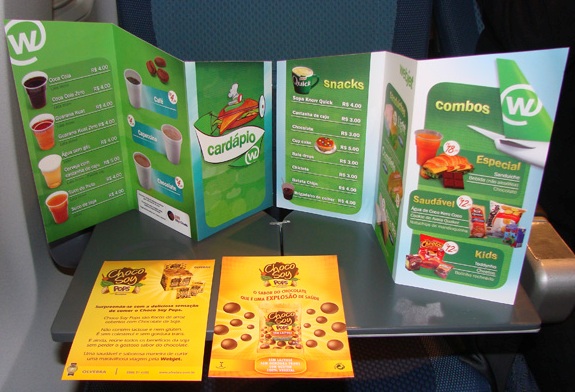 O serviço de bordo é outro destaque da Webjet. Quando se entra na aeronave, a aeromoça entrega um cardápio com as refeições vendidas a bordo (inclusive água… sim, água). E vendidas a preços bem competitivos… com aqueles estapafúrdios das lanchonetes do aeroporto de Brasília! Assim, uma lata de refrigerante sai por algo como R$ 4,00! Impressionante a cretinice da empresa de nem água oferecer aos passageiros! Mas já falei em outro post sobre pagar para beber água no ar…