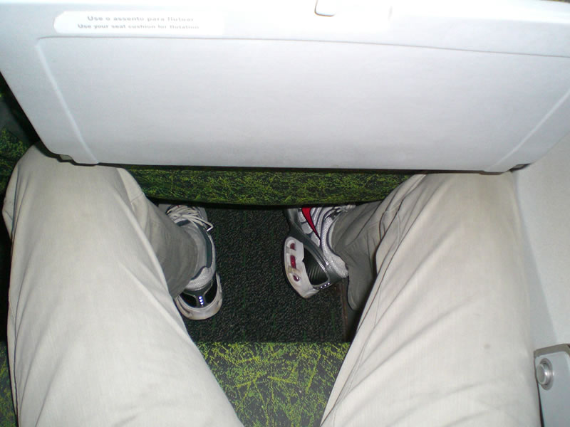 simplesmente, não reclinam (o que é natural, pois se assim não fosse, esmagariam o passageiro no assento detrás). Fiquei com pena de um rapaz de quase dois metros de altura que entrou no avião – ele acabou sentando de lado e ocupando duas cadeiras… Ainda sobre os assentos, como eles colocaram fileiras a mais, o adesivo que informaria o local das poltronas fica em uma posição entre as poltronas e não sobre elas, o que deixa a maior parte dos passageiros confusos.
