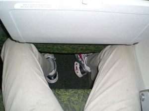 Vamos começar pela aeronave… A distância entre as poltronas é, simplesmente, inviável para qualquer pessoa com mais de 1,65 (e estou sendo gentil…). No meu caso, minhas pernas não só batiam no banco da frente como o braço do assento apertava a coxa… A sorte foi que não havia ninguém no assento do meio e então pude viajar em posição menos (ou, no caso da Webjet, menas) incômoda. Os bancos,