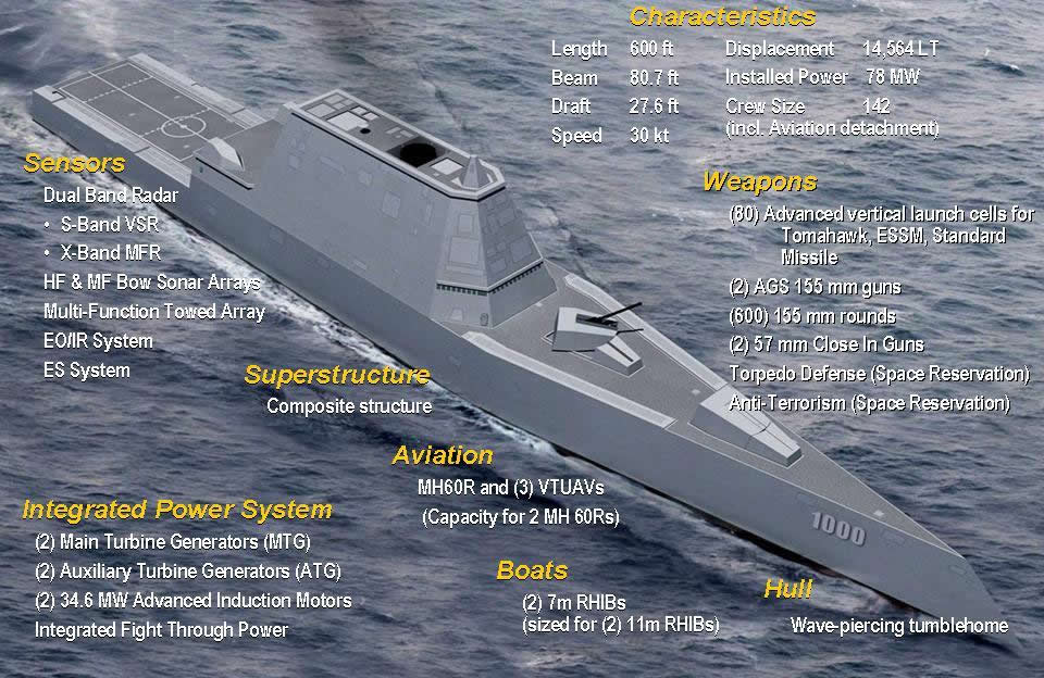 Escassamente tripulado, com 140 militares, tem grande poder de fogo. Ao menos 80 mísseis de cruzeiro Tomahawk – com alcance entre 800 e 1.300 quilômetros e ogiva de 450 quilos – de alta precisão, combinados com os Sparrow, antiaéreos, foguetes e torpedos, compõem o arsenal regular. A artilharia fixa usa granadas propelidas capazes de cobrir até 100 quilômetros. Dissuasão. O novo destróier é o sucessor de uma classe extremamente bem-sucedida, a Arleigh Burke, iniciada em 1991, e da qual foram entregues 62 navios. “Esperamos do DDG-1000 que seja invisível ao inimigo, que possa ver tudo com seu inacreditável sistema sonar-radar e, combinando tudo isso com a maciça capacidade de ataque, signifique um decisivo elemento dissuasivo – é o nosso futuro”, disse o então secretário de Defesa, Leon Panetta, no Congresso, em 2012.